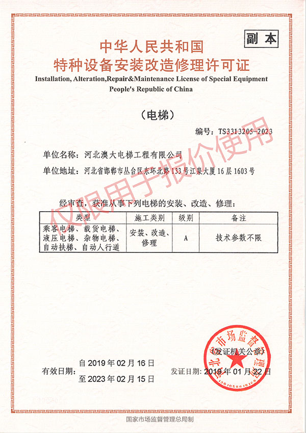 河北澳大電梯工程有限公司是集電梯銷售、安裝、維護(hù)保養(yǎng)為一體的專業(yè)化電梯公司。公司具有國家質(zhì)量監(jiān)督檢驗(yàn)總局頒發(fā)的“電梯安裝改造維修A級”資質(zhì)許可證。下設(shè)市場部、工程部、維保部、技術(shù)部、行政部及電梯配件公司。